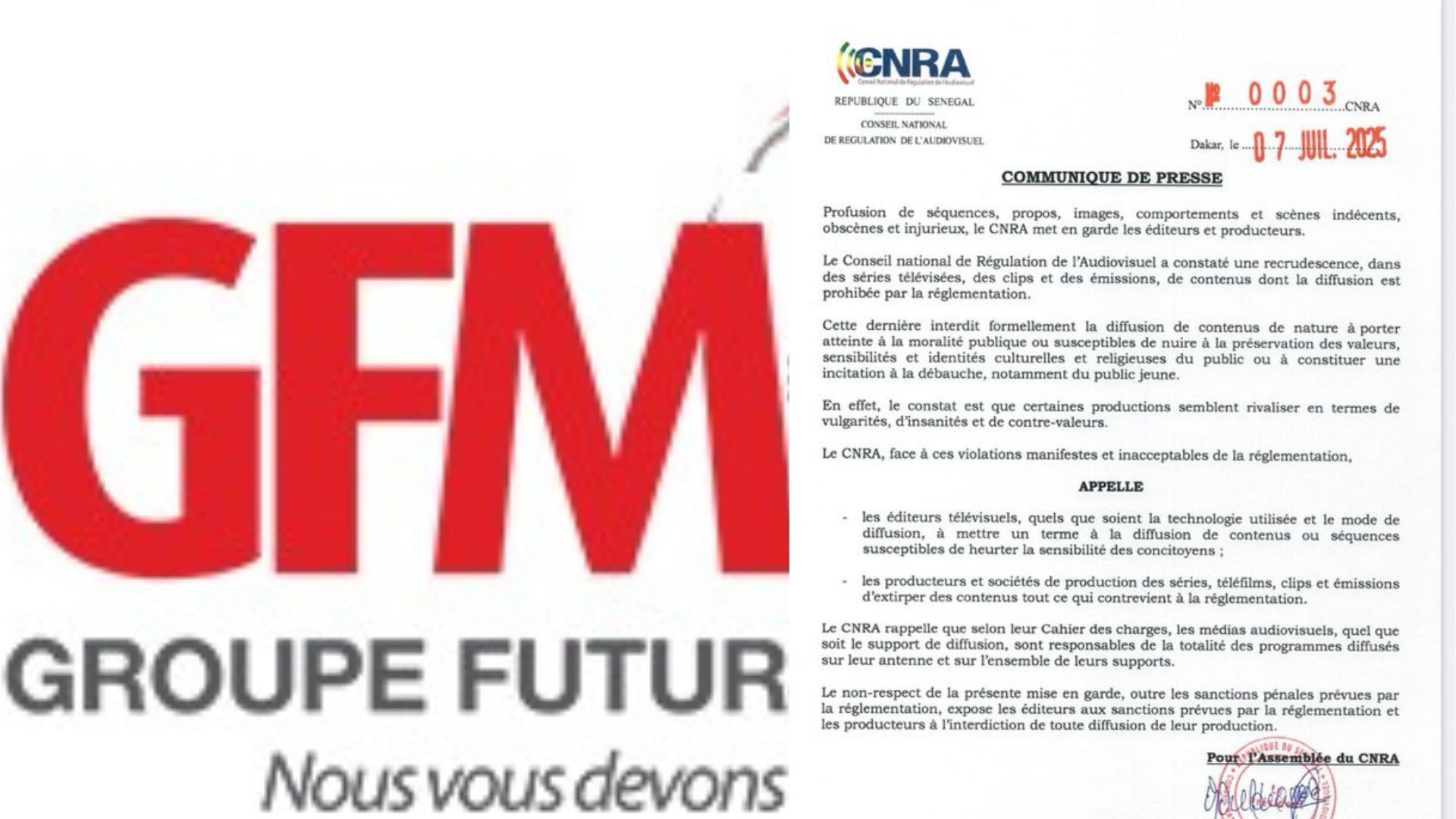 Le CNRA enjoint ainsi le Groupe Futurs Médias à prendre « les mesures appropriées » pour faire cesser définitivement ces dérives et à se conformer strictement à la réglementation. Le régulateur rappelle que le non-respect de cette mise en demeure expose la chaîne TFM à des sanctions pouvant aller jusqu’à la suspension de l’émission incriminée, voire de l’ensemble de ses programmes.